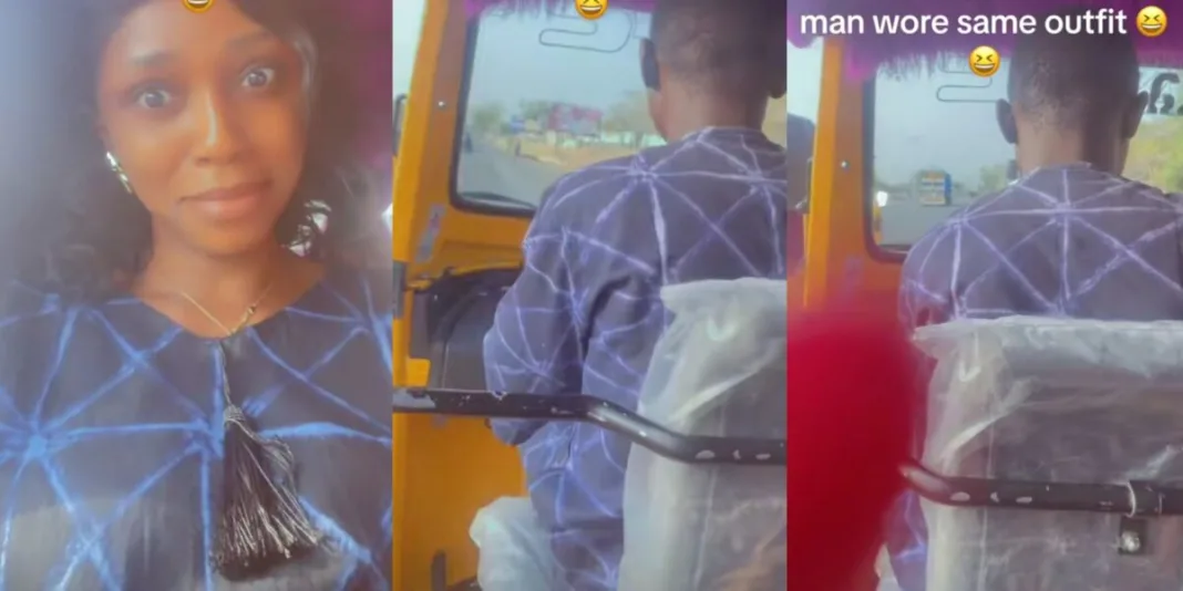 A Nigerian lady was left puzzled after hopping into a tricycle (Keke) only to realize that she and the rider were dressed in matching outfits. Finding the coincidence amusing, she took to social media to share the moment.